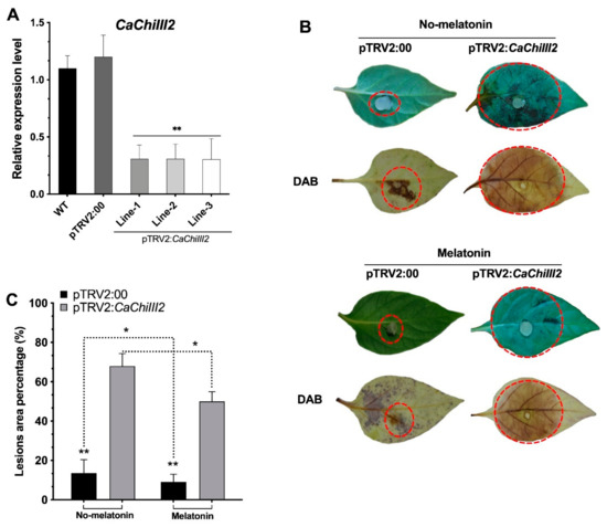Furthermore, the function of the CaChiIII2 gene and the effect of melatonin on the pepper plant resistance response was established through a detached leaf assay. Three days after inoculation, C. gloeosporioides injuries were observed on the leaf dorsal side of both TRV2:CaChiIII2 and TRV2:00 plants of the no-melatonin pretreated group. However, the infected area of the TRV2:CaChiIII2 was substantially larger (>83%) than those of the TRV2:00 plants. In the melatonin pretreated group, the infected leaf area was 50% in TRV2:CaChiIII2 plant, which was 82% higher than TRV2:00 (9%) (Figure 5B,C). The quantitative analysis revealed that due to the knockdown of CaChiIII2, the disease-infected area increased. Whereas the exogenous melatonin application restricted the growth of C. gloeosporioides infection to a larger extent, i.e., a 26% reduction in pTRV2:CaChiIII2 and 33% in pTRV2:00 plants. Generally, the generation of reactive oxygen species (ROS) is a common plant response under stress conditions [75]. The hydrogen peroxide (H2O2) biosynthesis was observed in pTRV2:CaChiIII2 plant leaves and turned brownish when stained with 3,3-diaminobenzidine (DAB). The development of brownish color on leaves with DAB staining indicated H2O2 accumulation (Figure 5B).
