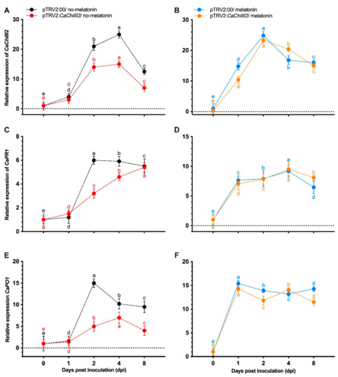 To confirm whether CaChiIII2 knockdown had any transcription altering effect, the levels of expression of other genes involved in the defense mechanism were also investigated. It was observed that the expression levels of CaPR1 [76] and CaPO1 increased in response to C. gloeosporioides infection. However, in pTRV2:CaChiIII2 the transcript levels of both genes were substantially lower than pTRV2:00 plants in the no-melatonin group (Figure 6C,E). On the other side, in the melatonin pretreated group, the expression of both defense-related genes was dramatically elevated in pTRV2:CaChiIII2 plants and reached the highest peak as TRV2:00 during C. gloeosporioides interaction (Figure 6D,F). On 8-dpi, the transcription of CaPR1 was 25% higher in pTRV2:CaChiIII2 plants relative to pTRV2:00 within the 100 µM melatonin treated group. In the no-melatonin group, there was a remarkable difference in the expression level of the same gene in CaChiIII2-silenced and control plants. So, melatonin treatment recovered the loss of the function of CaChiIII2 and also other associated genes, which exhibited high expression that was maintained during the rest of the infection period (Figure 6).