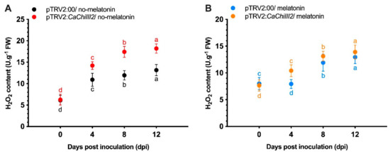 Compared with control (pTRV:00), the CaChiIII2-silenced (pTRV2:CaChiIII2) pepper plants had significantly higher H2O2 contents at 8 and 12-dpi in the no-melatonin group (Figure 7A). Whereas in both cases, melatonin treated and untreated, the CaChiIII2-silenced (pTRV2:CaChiIII2) plants had a highly significant concentration of H2O2 contents relative to control (pTRV2:00). With melatonin post-treatment, the contents remarkably decreased but obviously in pTRV2:CaChiIII2 at 8 and 12-dpi (Figure 7B).