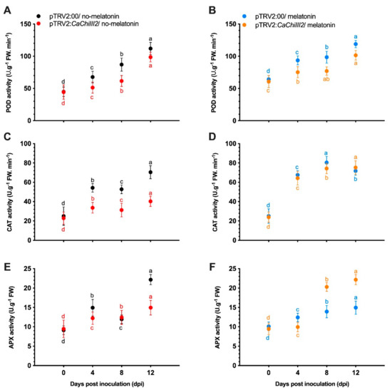 Effect of CaChiIII2 knockdown and exogenous melatonin treatment on antioxidant enzyme activities during C. gloeosporioides infection in pepper. (A) POD activities without melatonin pretreatment in pTRV2:00 and pTRV2:CaChiIII2, (B) 100 μM melatonin pretreated, (C) CAT activities without melatonin pretreatment in pTRV2:00 and pTRV2:CaChiIII2, (D) 100 μM melatonin pretreated, (E) APX activities without melatonin pretreatment in pTRV2:00 and pTRV2:CaChiIII2, (F) 100 μM melatonin pretreated. Mean values ± SDs of five replications are provided. Lower case letters (a–d) respective differences at p ≤ 0.05 with the DMR test.