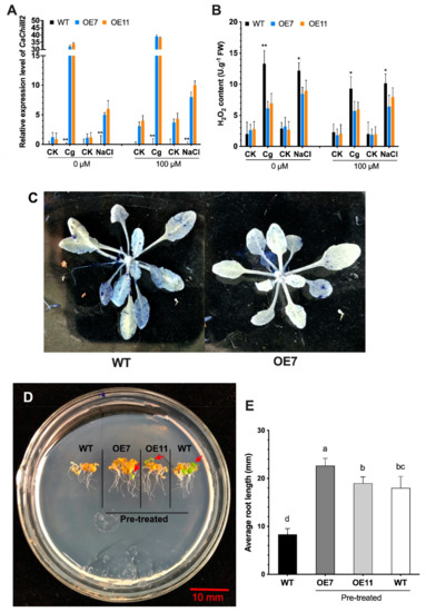 The open reading frame (ORF) sequence (with no stop codon) was amplified from the full-length cDNAs of CaChiIII2, subsequently inserted into a pVBG2307 expression vector (Figure S2) by using the set of restriction enzymes XbaI and KpnI. The specific primer pair was synthesized by Sangon (Shanghai, China) (Table S4), and the target fragment was sequenced by Invitrogen (Shanghai, China). For overexpression analysis, a recombinant fusion vector was used to transform into Arabidopsis plants (ecotype Columbia-0, Col-0) via Agrobacterium tumefaciens strain GV3101 [64,66]. Putative transgenes were confirmed on 50 mmol/L kanamycin selection medium. Further homozygosity was maintained up-to T3 generation, and each experiment was conducted on T3 homozygous line.
