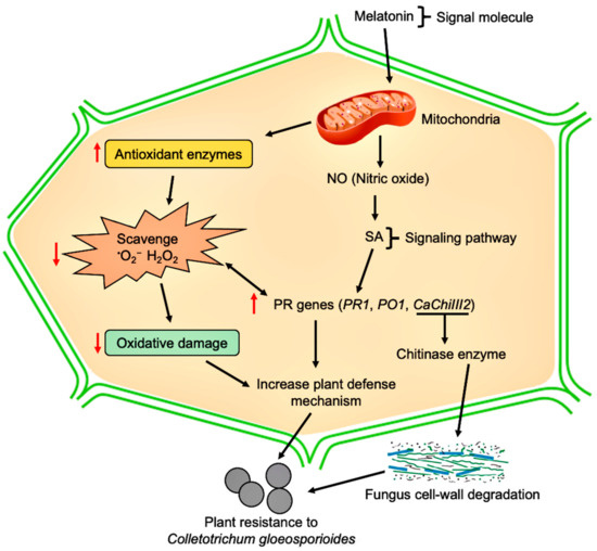 Based on previous work and the current study, a novel approach is suggested for melatonin mediated response to C. gloeosporioides infection in pepper plants (Figure 10). Exogenous application of melatonin remarkably increased the transcripts level of chitinase gene CaChiIII2 and mitigated the infection. Previous studies propose that exogenously applied melatonin works as a signaling molecule and increases the synthesis of nitric oxide (NO) and SA in the treated plants, while nitric oxide triggers the induction of SA accumulation [88,115,116]. The PR (PR1, PR5, and CaChiIII2) gene expression is triggered by higher amounts of SA [28,117], which in turn improves plant resistance to biotic stresses. Obviously, further work is required to explain the precise mechanisms involved in plant resistance against the fungus.