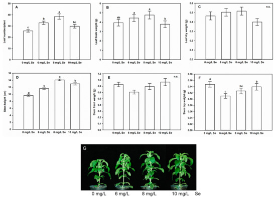 Selenium treatment affects shoot growth of Stevia rebaudiana L. Leaf number/plant (A), leaf fresh weight (g), (B), leaf dry weight (g), (C), stem height (cm), (D), stem fresh weight (g), (E) and stem dry weight (g), (F) of control (0 mg/L Se), 6, 8 or 10 mg/L Se-treated Stevia. Different letters indicate significant differences according to Duncan-test (n = 30, p < 0.05), “n.s.” indicates no significant difference. Representative photographs taken from control and Se-exposed Stevia shoots (G).