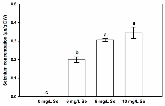 Foliar application of sodium selenate increases endogenous Se content of Stevia leaves. Selenium concentration (µg/g DW) in leaves of Stevia treated with 0, 6, 8 or 10 mg/L sodium selenate for two weeks. Different letters indicate significant differences according to Duncan-test (n = 3, p < 0.05).