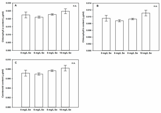 Pigment composition of Stevia leaves are not significantly modified by foliar Se application. Concentrations of chlorophyll a (A), b (B) and carotenoid (C) in leaves of Stevia treated with 0, 6, 8 or 10 mg/L Se. Different letters indicate significant differences according to Duncan-test (n = 8, p < 0.05), “n.s.” indicates no significant difference.