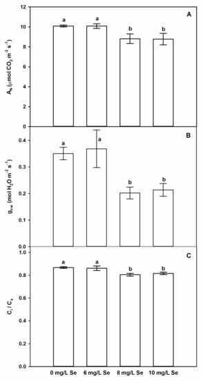 Treating plants with 8 or 10 mg/L Se slightly, but significantly reduced net assimilation rate of CO2 (AN, Figure 4A), stomatal conductance to water vapour (gSW, Figure 4B) and ratio of intercellular to atmospheric CO2 concentration (Ci/Ca, Figure 4C), which indicates that higher selenium concentrations enhanced stomatal limitation of photosynthetic CO2 assimilation in Stevia plants, but 6 mg/L Se treatments did not show significant effect on CO2 assimilation and related parameters. Although the effect of exogenous Se on photosynthesis has been examined in several plant species [73,79], to the best of our knowledge, there is no information available in the literature about the impact of Se supplementation on the photosynthetic activity of Stevia plants. Selenium supplementation mostly enhances or does not influence photosynthesis depending on the examined plant species [73]. The concentration range of Se supplementation is an important factor [80,81,82] as well as the developmental stage of the plant [83]. Although higher Se concentrations slightly limited photosynthetic CO2 assimilation in our system, these treatments shoved beneficial impact on leaf number or stem height. In Brassica juncea, Handa et al. [84] found that treatment with higher Se concentration limited photosynthetic CO2 assimilation and stomatal conductance in the presence of chromium, but did not limit plant growth under control circumstances.