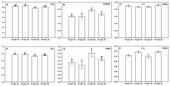 Selenium slightly alters photosynthetic activity of Stevia leaves. Changes in the effective quantum yield of PSII (Y(II) (A)), regulated (light-activated) non-photochemical energy dissipation (Y(NPQ) (B)), non-regulated non-photochemical energy dissipation (Y(NO) (C)), the quantum yield of PSI (Y(I) (D)), the quantum yield of non-photochemical energy dissipation due to donor side limitation of PSI (Y(ND) (E)) and the quantum yield of non-photochemical energy dissipation due to acceptor side limitation of PSI (Y(NA) (F)). Different letters indicate significant differences according to Duncan-test (n = 5, p < 0.05), “n.s.” indicates non-significant difference.