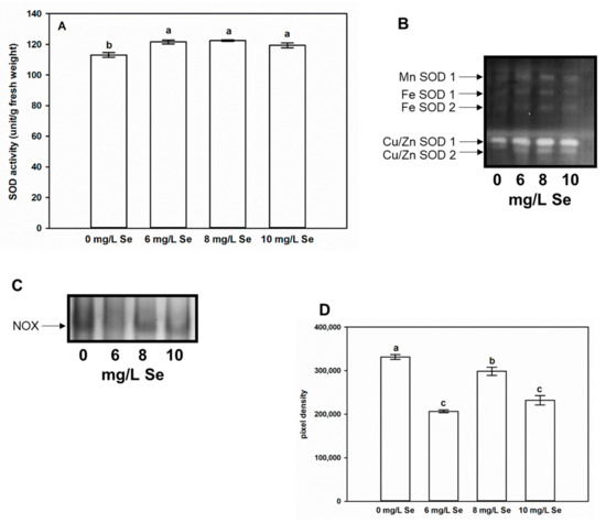 Selenium alters superoxide metabolism in Stevia leaves. (A) SOD activity (unit/g fresh weight) in leaves of Stevia plants treated with 0, 6, 8 or 10 mg/L Se for two weeks. Different letters indicate significant differences according to Duncan-test (n = 12, p < 0.05). Native PAGE separation of SOD (B) and NOX (C) isoenzymes of Stevia leaves. (D) Pixel density of the protein bands corresponding to NOX activity in Stevia leaves treated with 0, 6, 8 or 10 mg/L Se. Pixel densities were determined using Gelquant software (provided by biochemlabsolutions.com).