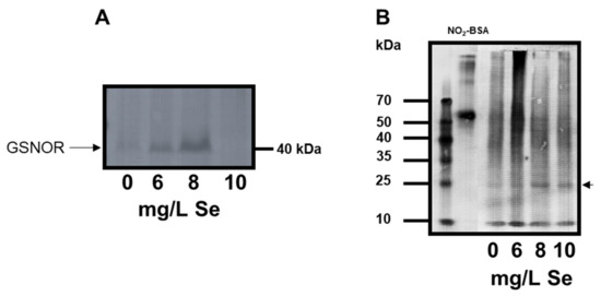 The amount of GSNOR protein, an enzyme that indirectly regulates protein S-nitrosation, was detected by western blot and found that 6 and 8 mg/L Se increased the protein amount, while 10 mg/L Se significantly decreased it compared to control (Figure 7A). Density measurement showed that the increment of GSNOR protein level was the most intense in the case of 8 mg/L Se treatment (Supplementary Figure S3). It has been reported that Se stress modifies GSNOR activity depending on the Se tolerance of Astragalus species [28]. In this experimental system, low Se doses-triggered increase in GSNOR abundance that could lead to downregulation of nitrosative signalling through protein S-nitrosation while the highest applied Se dose (10 mg/L) might exert the opposing effect.