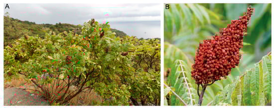 (A) Rhus coriaria plant and (B) Rhus coriaria fruit.