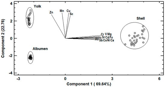 The concentrations of the 15 selected trace and macro elements in egg albumen, yolk and shell were subjected to principal components analysis (PCA) in order to investigate the relationships between the elements and detect those elements capable of distinguishing samples (Figure 1). PCA resulted in two principal components, which accounted for 92.40% of the total variability. Trace and macro elements in albumen, yolk and shell samples are presented in Figure 1, as a function of both first and second principal components. The first principal component (PC1) explained 69.64% of the total variability and was defined by the elements As, Ca, Cd, Co, Cr, Fe, Mg, Ni, Sb, Sr and V. The aforementioned elements were located away from the axis origin, suggesting that they were well represented by PC1 and closed together indicating a strong positive correlation. Egg shell samples were clustered near them and therefore, they had higher contents of these elements compared to the samples from egg albumen and yolk, which were clustered on the negative side of PC1. The second principal component (PC2) explained another 22.76% of the total variability and was defined by Cu, Mn, Se and Zn, which were placed closed together on the positive side of PC2, indicating a positive correlation. Samples collected from egg yolk were clustered near them, indicating higher contents of these elements compared to the samples from egg albumen and shell. Thus, a very clear separation of albumen, yolk and shell samples was observed.