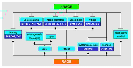 Wolf et al. also demonstrated that in vivo administration of RAGE-blocking antibodies ameliorated the clinical score of atopic dermatitis by reducing the levels of pro-inflammatory cytokines, even though the levels of IL-1α did not drop significantly [34]. Szczepanski et al. [35] studied a very specific skin district, i.e., the ear, and the correlation between the HMGB1/RAGE pathway and the pathogenesis of cholesteatoma. Through such a chain reaction, they noted an increase of RAGE levels on skin cells, a more consistent production of IL-8, and better protection from apoptosis of keratinocytes by phosphorylation of MEK (meiotic chromosome-axis-associated kinase) 1/2, STAT3, MAPK (mitogen-activated protein kinase) p44/p22, and NF-κB. All these effects were lost when the cell medium was enriched with RAGE-binding antibodies [35]. NF-κB and the subsequent production of IL-6 were also shown to be downregulated in mice with TPA-induced atopic dermatitis, when they were treated with Glycyrrhiza glabra, a direct inhibitor of HMGB1, one of the main ligands of RAGE [36]. Concerning the same mechanism, it is noteworthy that de Carvalho et al. investigated the role of RAGE in lichen planus, observing that its levels were more prominent in the upper layers of the dermis of patients compared with healthy controls, even though the levels of its mRNA were lower: they suggested that this might be due to the rapid translocation of HMGB1 by affected keratinocytes [37]. On the same note, but regarding atopic dermatitis, there is a study focusing on the role of quercetin in inhibiting the RAGE pathway through HMGB1 [38]: in this study, the authors observed downregulation of cytoplasmic HMGB1, RAGE, nuclear p-NFκB, p-ERK1/2, COX2, TNFα, IL-1β, IL-2Rα, IFNγ, and IL-4 and upregulation of nuclear Nrf2, which ultimately resulted in an attenuation of the atopic dermatitis-like lesions induced by a house dust mite extract applied to the dorsal skin of NC/Nga transgenic mice. Two more studies focused, respectively, on the difference between a physiological and pathological skin conditions such as skin thickness and inflammation, finding that RAGE expression directly correlated with epidermal thickness [39], and a possible relationship with levels of oxidative stress and artery diseases, finding that skin autofluorescence is increased in stable coronary artery disease and associated with soluble RAGE [40].