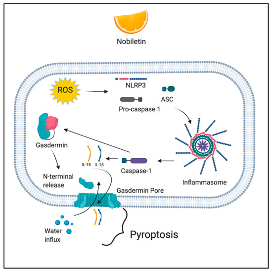 Nobiletin (5,6,7,8,3′,4′-hexamethoxyflavone) is a polymethoxyflavonoid extracted from citrus fruits. Nobiletin has various pharmacological activities such as antimetabolic disorder, anticancer, neuroprotection, anti-inflammation, antioxidation, and cardiovascular protection [119]. Nobiletin was studied for its anti-cancer activity in human ovarian carcinoma cell lines A2780 and OVCAR3. In the study, nobiletin treatment resulted in ROS generation, exhibited by a significant decrease in mitochondrial membrane potential in a dose-dependent manner. Further, ROS contributed to the cleavage of GSDMD and GSDME, the two biomarkers of pyroptosis among which GSDMD is considered to be an executioner of pyroptosis [120,121]. Figure 4 depicts the ROS-mediated pyroptotic action of phytochemicals.