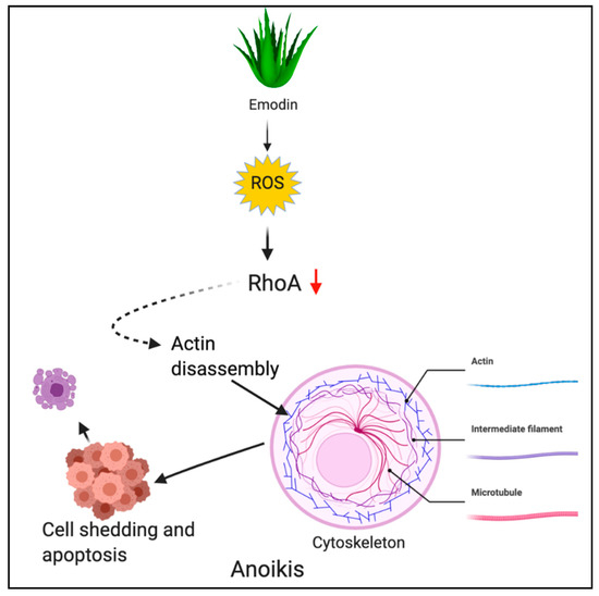 Emodin (1,3,8-trihydroxy-6-methylanthraquinone) is an anthraquinone derivative obtained from rhubarb plant (Rheum palmatum) and Aloe vera [122]. Emodin was shown to induce ROS generation followed by anoikis in gastric cancer cells. Emodin induced oxidative stress and caused inactivation of RhoA, a crucial signaling molecule in the cytoskeletal rearrangement. Inactivation of RhoA led to the disruption of focal adhesion complex and ultimately anoikis [61]. Figure 5 depicts the ROS-mediated anoikis by phytochemicals.