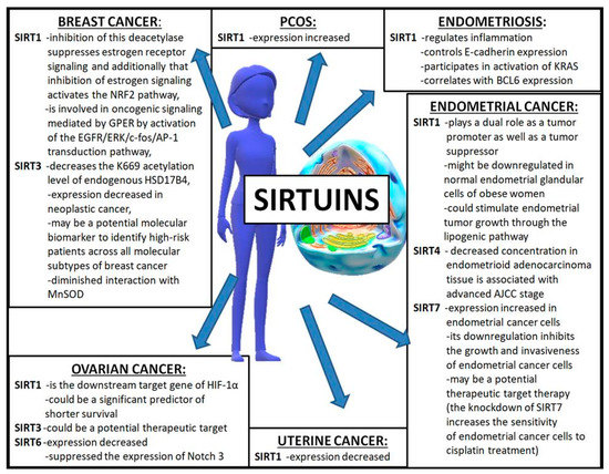 Typical female cancers have a poor overall survival rate in patients, and late disease presentation and chemo-resistance are the main factors that lead to the mortality of such patients [117]. Breast cancer is the second most common cause of female death after pulmonary cancer, and ovarian cancer has been described as the seventh most common female cancer [118,119]. Literature data have supported the important role of sirtuins in the functioning of the organism as well as in the proliferation, differentiation, cell cycle progression, and apoptosis of cancer cells [120,121,122].
