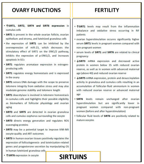 It is known that the maintenance of ovarian reserve and the development of oocyte competence at all stages can be hampered by extrinsic and intrinsic factors, which may target the ovarian microenvironment during the entire reproductive lifespan [16,65]. Additionally, physiological levels of reactive oxygen species (ROS) have a pivotal role in the female reproductive system during folliculogenesis and oocyte maturation and may also affect the outcomes of assisted reproductive technology (ART) [30]. Sirtuins regulate important physiological events, including aging and cell metabolism, mainly by protecting cells and tissues from oxidative damage. Ovarian aging decreases the quality of oocytes through the induction of mitochondrial dysfunction and increases in DNA strand breaks by accumulation of ROS. However, the involvement of sirtuins in the regulation of oocyte quality with aging has yet not been determined, but their role in the modulation of appropriate proteins responsible for the proper action of oocyte and folliculogenesis is indicated [66,67,68].