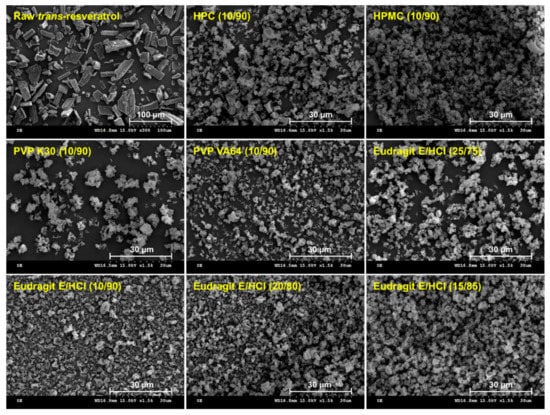 Scanning electron microscope images of raw trans-resveratrol and solid dispersion powders produced using the spray drying process.
