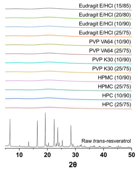 Trans-resveratrol was provided by Ningbo Liwah Pharmaceutical Co., Ltd. (Ningbo, China). Eudragit E PO (powder form of a cationic copolymer based on dimethylaminoethyl methacrylate, butyl methacrylate, and methyl methacrylate with a ratio of 2:1:1), polyvinylpyrrolidone K30 (PVP K30), and polyvinylpyrrolidone vinyl acetate 64 (PVP VA 64) were kindly donated by BASF (Ludwigshafen, Germany). Hydroxylpropylmethyl cellulose (HPMC 6 cp) and hydroxylpropyl cellulose (HPC-L) were kindly donated by Shin-Etsu Chemical Co., Ltd. (Tokyo, Japan), and Nippon Soda Co., Ltd. (Tokyo, Japan), respectively. Eudragit E/HCl (neutralized Eudragit E with hydrochloric acid) powder was prepared as previously reported []. All organic solvents of high-performance liquid chromatography (HPLC) grade were purchased from J.T. Baker (Phillipsburg, NJ, USA). All reagents used were of analytical grade and purchased from Sigma-Aldrich Co., Ltd. (St Louis, MO, USA) or Daejung Chemicals and Metals Co., Ltd. (Siheung-si, Korea).