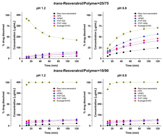 The enhanced dissolution properties of trans-resveratrol by amorphous solid dispersions were investigated using dissolution studies in pH 1.2 or pH 6.8 dissolution medium (non-sink condition). As shown in Figure 3, raw trans-resveratrol exhibited a slow rate and low degree of dissolution in pH 1.2 and 6.8 dissolution media because of its low solubility at pH 1.2 (52.3 μg/mL) and pH 6.8 (51.1 μg/mL) at 37 °C []. At a trans-resveratrol/polymer ratio of 25/75, Eudragit E/HCl showed a rapid dissolution rate, a maximum concentration of 365 μg/mL, and gradual subsequent precipitation of trans-resveratrol in the pH 1.2 dissolution medium. The concentration of trans-resveratrol at 120 min ranked by the SNK test increased in the following order: Eudragit E/HCl solid dispersion > HPMC solid dispersion > HPC solid dispersion > PVP solid dispersion, and PVP VA solid dispersion > raw trans-resveratrol. The dissolution data at pH 6.8 showed a similar trend to that at pH 1.2. Generally, the supersaturation and dissolution of poorly water-soluble compounds were enhanced by increasing the hydrophilic polymer amount in the amorphous solid dispersions [,,,,]. As shown in Figure 3, dissolution of trans-resveratrol was not significantly improved at a trans-resveratrol/polymer ratio of 10/90 compared with the other polymers, except Eudragit E/HCl. However, trans-resveratrol from the Eudragit E/HCl solid dispersion at a 10/90 ratio was completely dissolved within 30 min in pH 1.2 and pH 6.8 dissolution media. In addition, the precipitation of trans-resveratrol did not occur until at least 2 h in pH 1.2 and 6 h in pH 6.8 dissolution media. Among the tested polymers, Eudragit E/HCl was the most effective solid dispersion for the solubilization of trans-resveratrol.