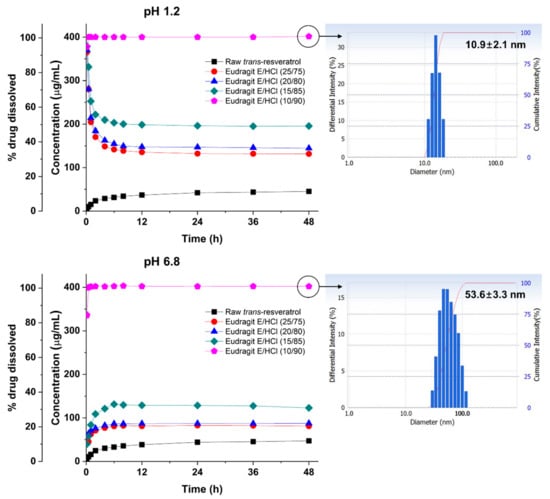 To further investigate the effect of Eudragit E/HCl on the dissolution of trans-resveratrol, amorphous solid dispersions were prepared at different trans-resveratrol/Eudragit E/HCl ratios of 25/75, 20/80, 15/85, and 10/90 and evaluated for 48 h in a pH 1.2 or pH 6.8 dissolution medium (non-sink condition). As shown in Figure 4, a high degree of supersaturation was observed within 30 min at all ratios, and Eudragit E/HCl significantly inhibited the precipitation of trans-resveratrol in the pH 1.2 dissolution medium in a dose-dependent manner. However, the degree of supersaturation of trans-resveratrol was enhanced by Eudragit E/HCl in the pH 6.8 dissolution medium in a dose-dependent manner. Interestingly, trans-resveratrol from the Eudragit E/HCl solid dispersion at a 10/90 ratio was completely dissolved within 30 min, and precipitation did not occur until at least 48 h in both the pH 1.2 and pH 6.8 dissolution media. At this time, DLS measurements were carried out to evaluate the soluble state of trans-resveratrol. As depicted in Figure 4, the solution’s mean particle size was 10.9 nm for pH 1.2 and 53.6 nm for pH 6.8. Yoshida and co-workers demonstrated micelle formation at Eudragit E/HCl concentrations above 30 μg/mL, and the particle size of tacrolimus-loaded Eudragit E/HCl micelles varied from 10 to 369.8 nm in different medium conditions [,]. Recently, Lin and co-workers reported the solubilization of ibuprofen, felodipine, and bifendate by Eudragit E in HCl solution via micelle formation []. In fact, the high solubilization of trans-resveratrol by Eudragit E/HCl solid dispersion prepared by the spray drying process might be used to estimate the formation of Eudragit E/HCl micelles, similar to previously reported poorly water-soluble compounds.