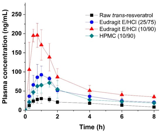 Plasma concentration-time profiles of raw trans-resveratrol and solid dispersion powders produced using the spray drying process after oral administration in Sprague-Dawley rats.