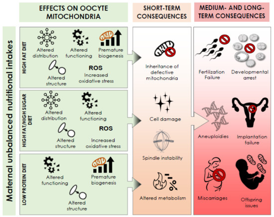 Maternal diet might harm women’s fertility, as suggested by several emerging evidence. Obese women, for instance, show reduced chance of conceiving both spontaneously and after medically assisted reproduction (MAR). However, obesity is just the tip of an iceberg that entails ovulatory subfertility, anovulatory infertility, and increased miscarriage rates after implantation. During MAR treatments, obese women show decreased responsiveness to gonadotrophins, retrieve fewer oocytes and of poorer quality, display reduced blastulation rates, and increased miscarriage rates [1]. In general, the maternal nutritional intake might affect the physiology of the mechanisms required for the acquisition of oocyte developmental competence during oogenesis. In fact, although female gametogenesis is a long path initiated in fetal life, its last crucial steps occur cyclically after menarche. It is exactly in this peri-conceptional period that nutrition might cause short-, medium-, and long-term effects on reproduction and on the health of the offspring. All these adverse outcomes have been imputed especially to epigenetic modifications and mitochondrial impairments [2,3,4].