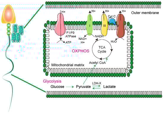 Schematic image of OXPHOS and glycolysis in spermatozoa. Pyruvate is produced by glycolysis and is then converted to lactate in the principal piece of spermatozoa by lactate dehydrogenase. Then, pyruvate in the principal piece is transported inside into the mitochondria and it is used as fuel for TCA cycles, which produce the NADH. OXPHOS take place in mitochondria of sperm midpiece. Oxidation of NADH in the electron transport chain produce the ATP molecules by OXPHOS.