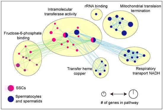 Signaling Pathways According to Differentially Expressed Genes between Spermatogonia and Spermatocytes/Spermatids. Molecular functions based on the differentially expressed genes in spermatogonia (SSCs) and differentiated male germ cells (spermatocytes and spermatids) were determining using g: Profiler, Cytoscape, and EnrichmentMap. Purple represents enrichment in spermatogonia, while blue represents enrichment in differentiated male germ cells. Node size indicated how many genes are involved to pathways.