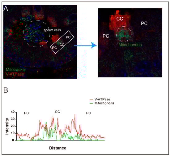 Different distribution of mitochondria between clear cells and other cells in the epididymis. Mitochondria were labelled with a Mitotracker (Green) and clear cells (CCs) were labelled with V-ATPase (Red). Representative images (A) show the different distribution of mitochondria between clear cells and other cells, such as principal cells (PCs, unlabeled cells). The fluorescence intensity results (B) indicated that mitochondria are more enriched in clear cells than principal cells. The images were obtained using Nikon Eclipse Ni-U equipped with a Nikon DS-Ri2 camera and the Nikon NIS-Elements Fr software (Version 5.11, Nikon Instruments Inc., Melville, NY, USA).
