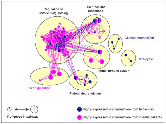 Signaling pathways according to differentially expressed genes between fertile and infertile human spermatozoa. Signaling pathways based on the differentially expressed proteins in spermatozoa from fertile and infertile men were determined using g: Profiler, Cytoscape, and EnrichmentMap. Blue represents enrichment in spermatozoa from fertile men, while purple represents enrichment in spermatozoa from infertile patients. Node size indicated how many genes are involved with pathways.