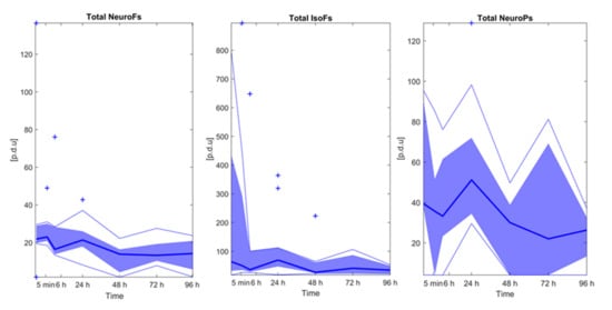Isoprostanoid levels over time. Note: Bold blue lines correspond to median values, blue areas correspond to the interquartile range (1st and 3rd quartile), thin blue lines correspond to minimum and maximum values, and + correspond to outliers. Note: NeuroFs = neurofurans; IsoFs = isofurans; NeuroPs = neuroprostanes.