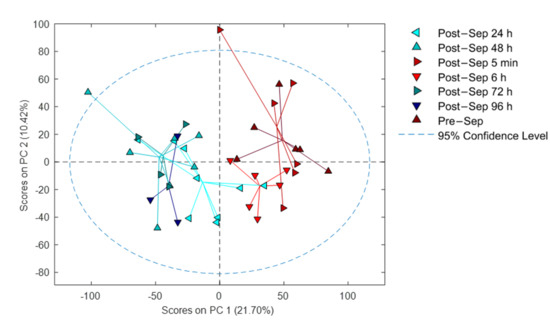 Figure 3 shows a PCA scores plot of the plasma metabolic fingerprint of infants before BAS and at different time points after BAS. The scores plot from PC1 vs. PC2 illustrates the impact of the sampling time point on the plasma metabolome. For most patients, a time-dependent shift towards lower scores on PC1 with increasing time after septostomy was observed. Even though the applied data analysis workflow included the removal of drug metabolites, this effect might, at least partially, be related to the employed medication and the procedure itself. Also, a high inter-individual variation can be noted.
