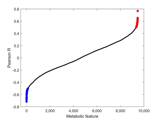 Pearson correlation coefficients between metabolic features and FTOE. Blue: features with p-values < 0.05 and correlation coefficients < −0.5; red: features with p-values < 0.05 and correlation coefficients > 0.5; black: all remaining features.