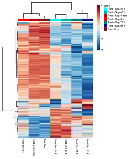 FTOE reflects the balance between oxygen supply and consumption in tissue and can, therefore, be used as an indicator of inadequate tissue perfusion and oxygenation. We specifically focused on modelling the effects of metabolic changes in the plasma metabolome associated with FTOE. Pearson correlations for each metabolic feature with FTOE before and at different time points post-septostomy were calculated as shown in Figure 4. A panel of features with a significant association with FTOE (i.e., p-values from Pearson correlation < 0.05) was identified including both, positively (red dots, correlation coefficient > 0.5) and negatively (blue dots, correlation coefficient < −0.5) correlated features. Figure 5 shows a heatmap of the relative intensities of significantly correlated features. Two distinct clusters can be observed, with plasma fingerprints from samples collected before and 5 min as well as 6 h after BAS belonging to one cluster, and samples collected 24–96 h after BAS belonging to a second cluster. Most metabolic features in Figure 5 showed a decreasing trend in relative intensities when comparing cluster one to cluster two. Pathway analysis detected four significantly altered pathways associated with changing FTOE in infants with TGA undergoing BAS (see Table 3).