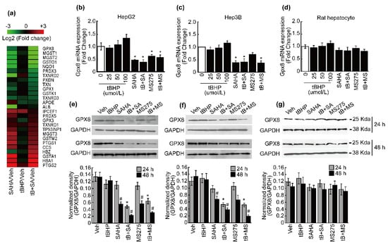 Suppression of GPX8 by oxidative stress and HDACi in HCC. (a) Heatmap of antioxidant enzymes with expression changes exceeding 2-fold upon SAHA or combined treatment with tBHP and SAHA in HepG2 cells. (b) Expression of Gpx8 mRNA was insignificantly changed by tBHP, but significant reductions were induced by HDACi and HDACi combined with tBHP. (c) Expression of Gpx8 mRNA was negligibly changed by tBHP but significantly decreased by SAHA and combinatorial treatment with tBHP and HDACi in Hep3B cells. (d) Gpx8 mRNA was negligibly changed by tBHP, HDACi, and co-treatment in rat hepatocytes. Protein level of GPX8 was analyzed by Western blotting. At 24 h after treatment, altered GPX8 expression was only observed in cells receiving combined treatment with HDACi and tBHP, while significant downregulation from a single treatment with HDACi became evident 48 h after treatment in HepG2 (e) and Hep3B (f) cells. (g) GPX8 protein level was negligibly changed by tBHP, HDACi, or combined treatment in rat hepatocytes. All graphs were presented as the mean ± SD of three independent experiments (*, # p < 0.05 vs. vehicle).