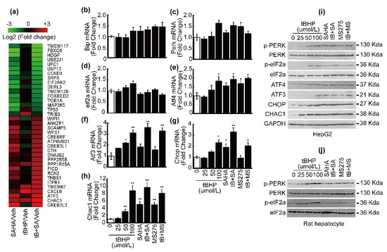 Co-treatment with tBHP (25 μmol/L) and HDACi (1 μmol/L) elevated ER stress gene expression. (a) Heatmap of ER-stress-related genes whose expression changed more than 2-fold by SAHA or combined treatment with tBHP and SAHA in HepG2 cells. Expression of Bip (b), Perk (c), and eif2a (d) negligibly changed upon tBHP, HDACi, and combined treatment with both. (e) Atf4 mRNA expression significantly increased at a high concentration of tBHP (100 μmol/L) and combined treatment with tBHP and HDACi. (f) Atf3 mRNA expression significantly increased by tBHP in a dose-dependent manner. Co-treatment with tBHP and HDACi significantly elevated the expression of Atf3 mRNA. (g) Chop mRNA expression significantly increased by a high concentration of tBHP (100 μmol/L), SAHA, and combined treatment with tBHP and HDACi. (h) Expression of Chac1 increased by tBHP in a dose-dependent manner. Chac1 mRNA expression was induced upon a single treatment with HDACi as well as combined treatment. (i) Incremental, though not significant, changes to total PERK and eIF2a expression were induced by tBHP and/or HDACi, whereas phosphorylated forms of PERK and eIF2a dose-dependently increased by tBHP. A single treatment with HDACi increased the expression of phosphorylated PERK and eIF2a, which synergistically increased by combined treatment with tBHP and HDACi. Protein levels of ATF4, ATF3, CHOP, and CHAC1 increased by tBHP in a dose-dependent manner. The expression of these proteins was elevated by HDACi treatment alone, which synergistically increased by combinatorial treatment in HepG2 cells. (j) Phosphorylation levels of PERK and eIF2a dose-dependently increased by tBHP but were unaffected by HDACi or combinatorial treatment in rat hepatocytes. Data were presented as the mean ± SD of three independent experiments. (* p < 0.05, ** p < 0.01 vs. vehicle).