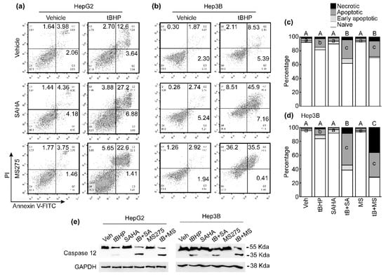 Combined treatment with tBHP and HDACi induced apoptosis in HCC cells. Apoptosis of HCC cells after treatment with tBHP (25 μmol/L), SAHA (1 μmol/L), MS275 (1 μmol/L), or combinatorial treatment with tBHP and HDACi. (a) A single treatment with tBHP, SAHA, or MS275 showed a negligible effect on HepG2 cell apoptosis. Co-treatment with tBHP and HDACi dramatically increased apoptosis. (b) Hep3B cell death negligibly changed by a single treatment with tBHP, SAHA, or MS275. Both apoptotic and necrotic Hep3B cell populations drastically increased by combinatorial treatment with tBHP and HDACi. The mean of three independent FACS results from HepG2 (c) and Hep3B (d) was presented as stack columns. Different letters indicate significant differences at p < 0.05. ANOVA analyses of necrotic cells and late apoptotic cells are denoted using uppercase and lowercase letters, respectively. (e) Cleavage of caspase 12 was detected by Western blot.