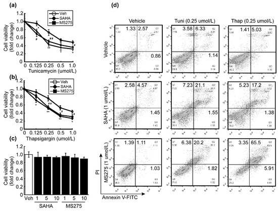 We investigated whether HDACi enhances the effect of classical ER stressors such as tunicamycin and thapsigargin. Tunicamycin inhibits N-glycosylation on proteins to result in improper protein folding, while thapsigargin inhibits Ca2+-ATPase in the sarco-/endoplasmic reticulum, resulting in depletion of calcium in the lumen. These two compounds induce apoptosis through the induction of the UPR signaling pathway [41]. A single treatment with tunicamycin or thapsigargin decreased cell viability of HepG2 in a dose-dependent manner, whose cytotoxic effect was synergistically enhanced by the addition of HDACi such as SAHA or MS-275 (Figure 5a,b). Apoptosis appears to be the main cause of decreased cell viability, because combinatorial treatment with tunicamycin or thapsigargin with HDACi drastically elevated apoptotic cells (Figure 5d).