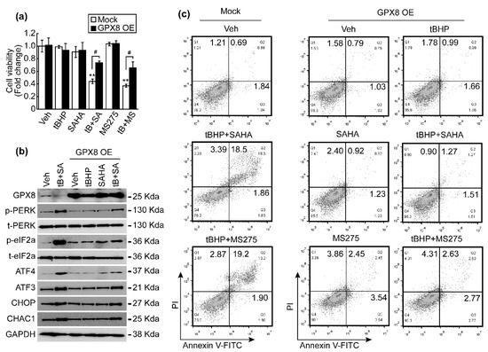 Overexpression of GPX8 reduced the ER stress and apoptosis induced by co-treatment with tBHP (25 μmol/L) and HDACi (1 μmol/L). (a) Cell viability was analyzed after treatment with tBHP, HDACi, or combined tBHP and HDACi in normal HepG2 and GPX8-overexpressed HepG2 cells. GPX8 overexpression reversed the cell viability loss resulting from tBHP and HDACi co-treatment. (b) Protein level of ER-stress-related genes was analyzed by Western blotting. Changes in expression of total PERK and eIF2a were negligible regardless of reagent treatment or GPX overexpression. Phospho-forms of PERK and eIF2a significantly increased by combined treatment with tBHP and SAHA, which was reversed by overexpression of GPX8. GPX8 overexpression reduced the co-treatment-induced increase in ATF4, ATF3, CHOP, and CHAC1 expression. (c) Cell death was analyzed by FACS. Overexpressing GPX8 inhibited the apoptosis induced through tBHP and HDACi co-treatment. Graphs showed the mean ± SD of three independent experiments (** p < 0.01 vs. vehicle, # p < 0.05 mock vs. GPX8 overexpression).