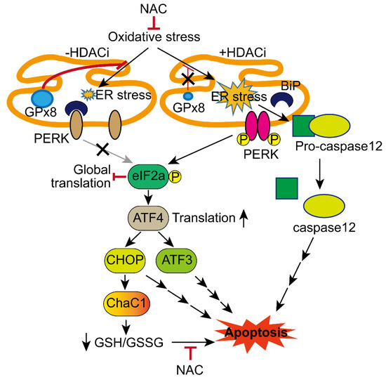 In conclusion, HDACi represses the expression of GPX8, rendering HCC cells to become more vulnerable to ER stress and apoptosis, even under mild oxidative stress conditions. Oxidative stress and HDACi-induced CHAC1, a downstream effector of the PERK/eIF2a/ATF4 signaling pathway, exacerbate intracellular oxidative stress by depleting GSH, which plays a role in HCC apoptosis induced by oxidative stress and HDACi, as summarized in Figure 8.