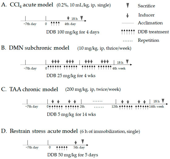 For the acute liver injury models, forty-eight male BALB/c mice (8 weeks old) were purchased from Daehan-Biolink (Chung-buk, Korea). For the subchronic and chronic liver injury model, forty-eight Sprague Dawley (SD) male rats (6 weeks old) were obtained from Orient Bio (Gyeonggi-do, Korea). After one week of acclimation, the animals were divided into 3 groups, with 8 animals in each group for each experiment. For the chemically induced acute model, BALB/c mice were treated with 0.2% carbon tetrachloride (Junsei, Tokyo, Japan) via a single ip injection. For the subchronic liver injury model, SD rats were injected intraperitoneally with 10 mg/kg DMN for 3 weeks. For the chronic liver injury model, SD rats were treated with 200 mg/kg TAA for 14 weeks. For the psychological acute liver injury model, all four limbs of BALB/c mice were tightly fixed in to a grid with quartz-pasted tape for 6 h. DDB was orally administered at doses of 100 mg/kg, 25 mg/kg, 5 mg/kg and 50 mg/kg in the chemical acute, subchronic, chronic and psychological acute liver injury models, respectively. Detailed information on the four experimental designs and schedules is shown in Table 1 and Figure 1.