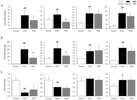 Both CCl4, DMN, and TAA treatment and restraint stress significantly elevated the serum AST (p < 0.01) and ALT (p < 0.01) levels as compared to normal (Figure 2A,B). However, DDB administration markedly attenuated these excessive AST (CCl4: p < 0.05, DMN, p < 0.01, Figure 2A) and ALT (CCl4: p < 0.01, DMN, p < 0.01, Figure 2B) in the CCl4 and DMN models but not in the TAA and restraint stress models.
