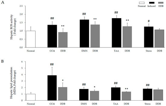 Four liver injury inducers, including CCl4, DMN, TAA, restraint stress, markedly increased productions of ROS and MDA in liver tissue (CCl4: p < 0.01, DMN, p < 0.01, TAA: p < 0.01, Stress, p < 0.05 or p < 0.01, Figure 3B) as compared to normal, whereas DDB significantly reduced these alterations in three hepatoxin models (CCl4: p < 0.05 or p < 0.01, DMN, p < 0.05 or p < 0.01, TAA: p < 0.01), but not in the psychological stress model.