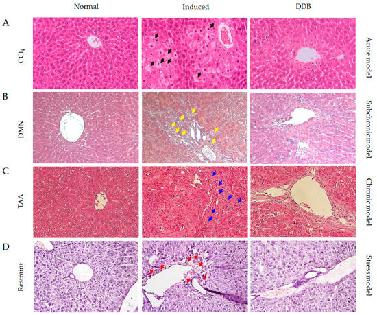 Along with the consistent results above, we confirmed the histological improvements promoted by DDB in CCl4 induced noticeable hepatocyte swelling (black arrows) and coagulation necrosis (Figure 5A), and DMN triggered mild collagen deposition and bile duct hyperplasia (yellow arrows) (Figure 5B). However, DDB treatment did not notably attenuate the severe distortions in the hepatic architecture characterized by excessive accumulation of extracellular matrix (blue arrows) in the TAA-induced chronic injury model (Figure 5C). Finally, obvious neutrophil infiltration (red arrows) was observed in the liver parenchyma under restraint stress conditions (Figure 5D). Notably, many clinical studies have revealed that DDB significantly normalizes the release of ALT but has no significant effect on the histologic or fibrotic changes in patients with chronic viruses [23]. We herein compared the hepatoprotective efficacies of DDB among four liver injury models; however, our study has some limitations. Firstly, the present study employed three xenobiotic-induced injury models and one psychogenic stress-induced injury model, which are thought to have difficulty reflecting clinically frequent disorders, such as viral-, alcohol- and nutrition overload-related liver injuries. Another limitation is that different dosages of DDB were used for treatment in the four injury models, even though we designed our study according to previously reported articles, which suggest high doses for acute injury and low doses for chronic injury [20,57].