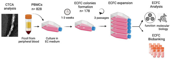 Schematic of the workflow of the study. CTCA: Computed Tomography Coronary Angiography, EC: Endothelial Cells, ECFC: Endothelial Colony Forming Cells, PBMCs: Peripheral Blood Mononuclear Cells. Created with BioRender.com (accessed on 15 September 2021).