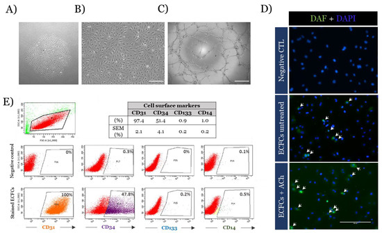 Flow cytometry: For the characterization of the ECFCs, 105 cells were incubated with human receptor Fc block (BioLegend, San Diego, CA, USA; 422301) for 10 min at room temperature. Cells were individually stained using a 1:20 dilution in staining buffer (BioLegend) of CD31-APC (BioLegend, #303115), CD34-PE (BioLegend, #343605), CD133-Brillant Violet 421 (BioLegend, #372807), and CD14-FITC (BioLegend, #367115) in a cell-staining medium (BioLegend, #420201) for 30 min on ice while being protected from light. Cells were washed and resuspended in staining buffer before being analysed on a BD LSRFortessa cell analyser (BD Science, Franklin Lakes, NJ, USA) flow cytometer. An unstained sample was used as a negative control. Quantification of the antigenic profile was performed using BD FACSDiva software.