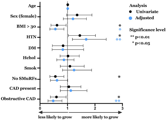Odds ratios for association between clinical factors and successful ECFC Growth. Multivariable logistic regression models were performed, adjusting for age, sex and independent variables with p < 0.1 for univariate associations. Black dots represent univariate associations and blue dots represent adjusted odds ratios. Bars represent 95% confidence intervals. BMI: Body Mass Index > 30 kg/m2, HTN: hypertension, DM: Diabetes Mellitus; Hchol: Hypercholesterolemia. Smok: Significant smoking history (>10 pack years); No SMuRFs: >0 SMuRFs; CAD present: Gensini score > 0: Obstructive CAD (>50% stenosis).
