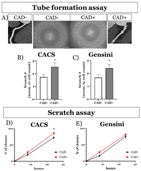 We next sought to investigate whether the function of ECFCs was affected when they were derived from patients with confirmed CAD. For this purpose, we used both the Gensini score and the CACS. ECFCs isolated from patients with CAD had a ≈45% increase in branch formation on Matrigel as compared to ECFCs of patients with no CAD (CACS > 0 vs. CACS = 0, p = 0.044 (Figure 4A,B); Gensini > 0 vs. Gensini = 0, p = 0.048 (Figure 4A,C)). Similarly, using a cell scratch assay, we found that the migratory and proliferative capacities of ECFCs from patients presenting CAD were ≈18% higher (CACS > 0 vs. CACS = 0, p = 0.03; Gensini > 0 vs. Gensini = 0, p = 0.18) (Figure 4D,E). The results of these assays after sex segregation are reported in Supplemental Figure S2A–D; no significant differences were identified.