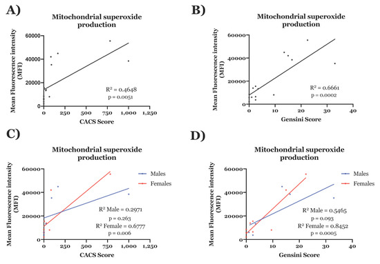 Considering the importance of mitochondrial dysfunction and oxidative stress in the development of atherosclerotic plaques [28], we next assessed for associations between CAD and measures of mitochondrial function in the ECFCs. Using MitoSOX, we found that the mitochondrial production of superoxide of ECFCs was positively correlated with the severity of the CAD as measured by either the CACS (R2 = 0.46; p = 0.0051); Figure 5A) or the Gensini score (R2 = 0.67; p = 0.0002; Figure 5B). The correlation of MitoSOX was particularly strong in females, with an R2 of 0.84 in relation to the Gensini score (p = 0.0005; Figure 5D).