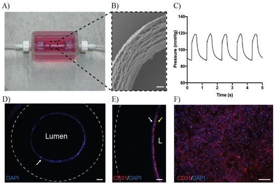 ECFCs rapidly form a confluent monolayer when grown in 3D under physiological conditions. (A) Vascular bioreactor Scheme 3. D cell growth on (B) fibrous PCL-gelatin scaffolds. Scale bar = 200 µm. (C) Seeded ECFCs were exposed to pulsatile pressure approximating human physiology. After 24 h, harvested grafts showed (D) a confluent monolayer of cells lining the graft lumen, staining positive for DAPI (White arrow, scale bar = 200 µm) and (E) CD31 (yellow arrow)/DAPI (white arrow). Scale bar = 50 µm. (F) Imaging of open graft sections supported the growth of a confluent layer of cells also staining CD31 positive. Scale bar = 100 µm.